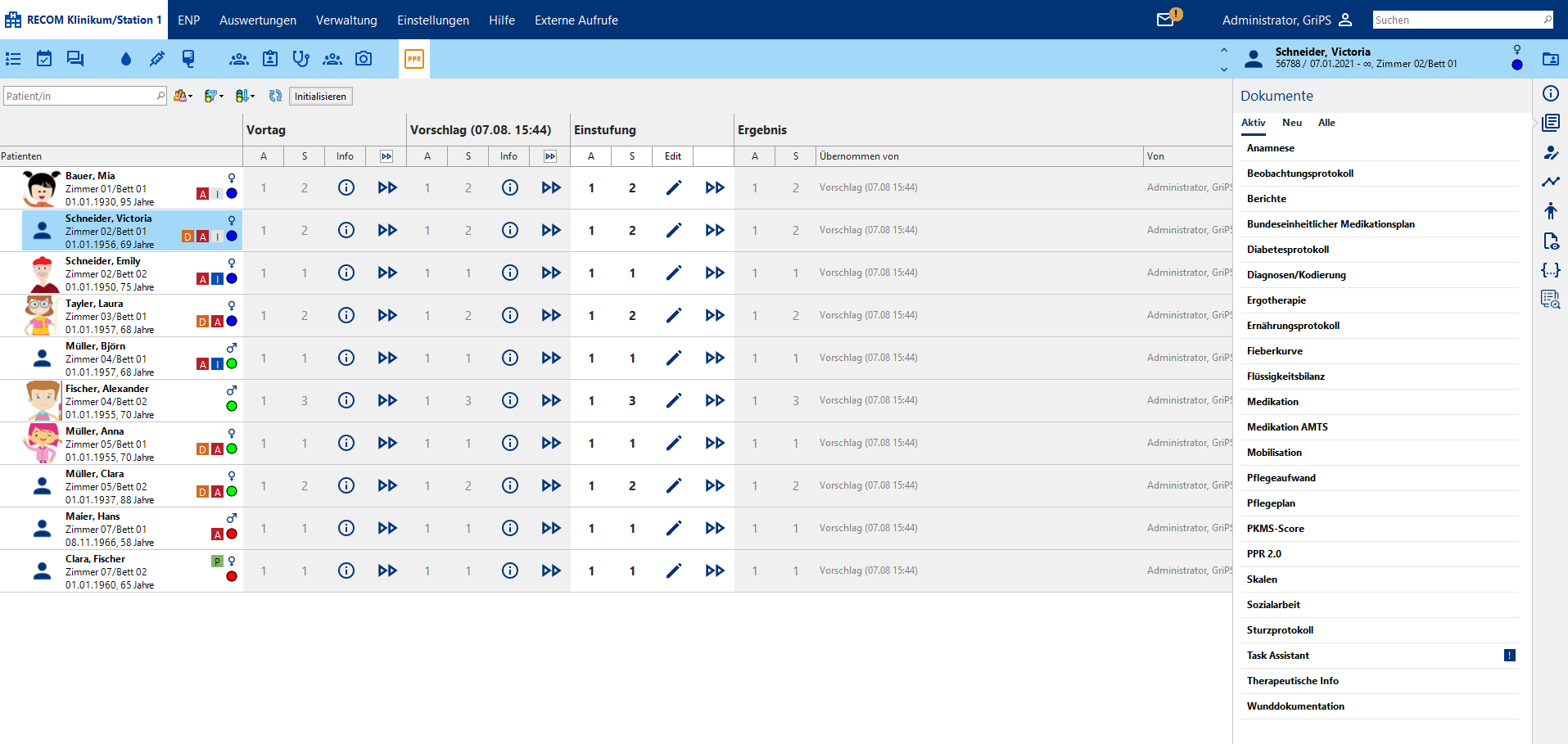 Mit der Umsetzung der PPR 2.0 als Modul in der digitalen Pflege- und Behandlungsdokumentation RECOM-GRIPS reduzieren Sie massiv die Fehleranfälligkeit, sparen Zeit und können trotzdem jederzeit Einfluss nehmen auf vorhandene PPR-Einstufungsvorschläge. Die Software generiert automatisch aus der Regeldokumentation für jeden Patientenfall und jeden vorgeschriebenen PPR-Einstufungszeitraum die PPR-Einschätzung. Dabei werden umfassende Daten beispielsweise aus der Medikation, der Wunddokumentation und den Mobilisationsplänen herangezogen. Einzig die Freigabe bzw. der Double Check obliegt dem Fachpersonal und ist mit einem Klick für eine ganze Station erledigt, ebenso ist eine manuelle Änderung natürlich immer möglich.